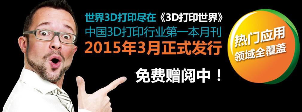 2月9日,珠海再生時代宣布,將于2015年3月起發售中國3D打印行業第一本月刊,該月刊已確定命名為《3D打印世界》,預定每月一期,限量發售2萬本。內容覆蓋醫療、模具、汽車等各個應用領域。屆時,也將同步發售電子版,并將于各大互聯網媒體合作。