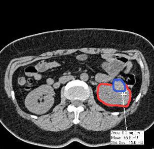 某醫院的外科醫生需要做一個3D腎臟模型,但CT片拍出的二維圖像中,其腫瘤位置只是通過灰色的色階來表示(臨床應用中稱之為CT值),如上圖中紅色圈出來的是腎臟截面,藍色則為腫瘤位置。從圖中可以看出,在CT片子中藍色部分僅僅比紅色部分要白一點。